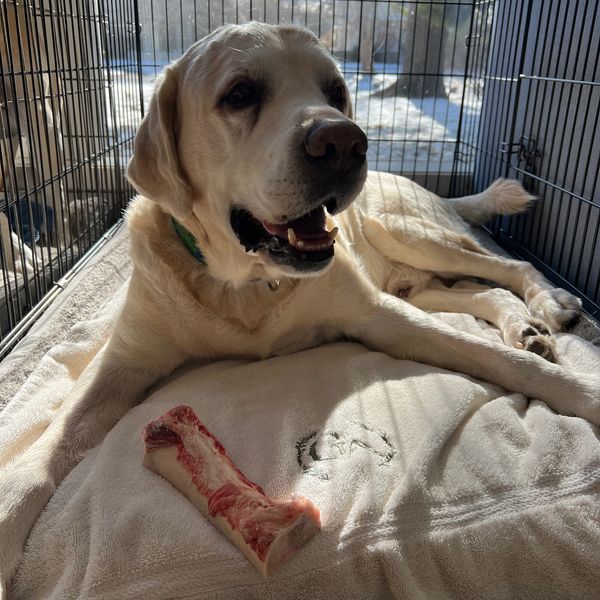 Scout enjoyed a big raw bone on his birthday, along with fresh chicken soup and lots of 'lovin.